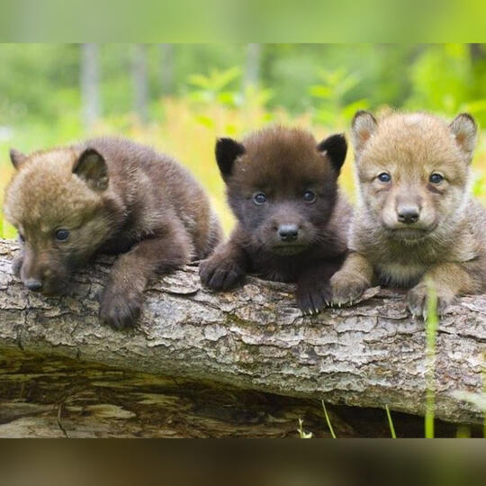 Channing Echo, Alaska Moon, and Asena Vala were born on Christmas Day 2021- 12•25•21. It was a beautiful snowy evening when the wolf hybrids came into the world which is seen as a blessing from the gods. Asena, one of the brown pups, is the quiet one of the bunch and was the runt of the litter, but quickly caught up to her siblings. Alaska is like her father and future female alpha of the family and is a black pup. Channing, while reserved, isn't shy as the second brown pup; he shows that he can reason with logic, like Yugy. Their older siblings, Atty and Cassi, love having new pups to play with that closely resemble them also being canines.